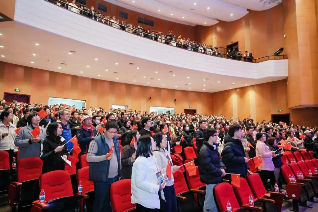 而当《我爱你中国》的熟悉旋律响起,全场沸腾。师生们起立挥舞红旗,歌声如潮水般奔涌,台上台下汇聚成一片红色的海洋,炽热的爱国之情在乐声中久久回荡。